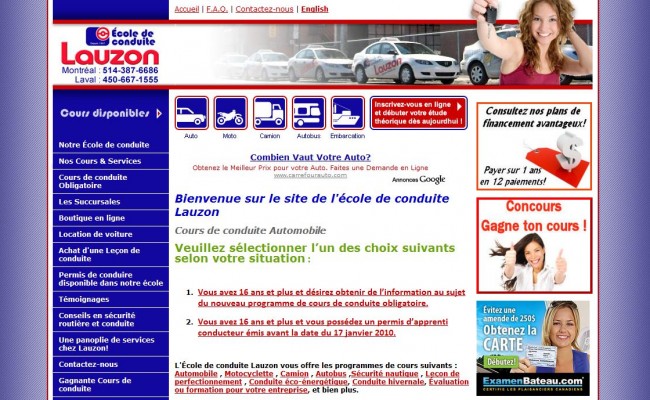 2007 : Design, programmation, intégration dans un CMS et SEO. Première position avec (école de conduite) et (cours de conduite) sur Google.ca